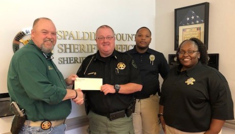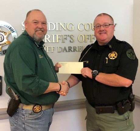 Sheriff Darrell Dix presents a check for $10,000 to Mike Leathers for the Georgia Sheriff’s Youth Homes. Photo courtesy of the Spalding County Sheriff’s Office
