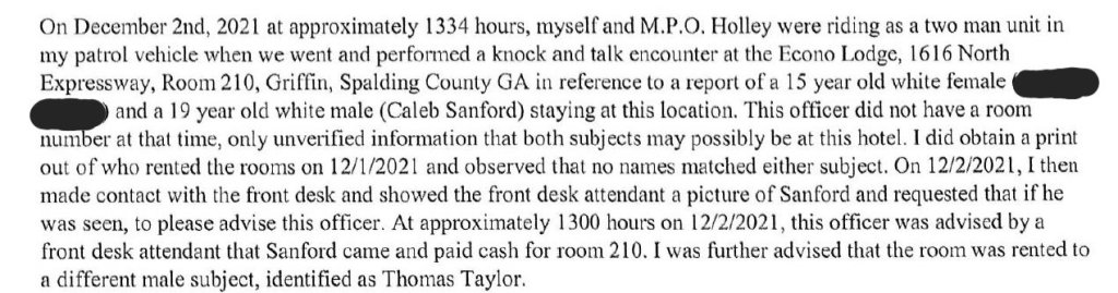 “At approximately 1300 hours (1 p.m.) on 12/2/2021, this officer (Dorety) was advised by a front desk attendant that Sanford came and paid cash for room 210. I was further advised that the room was rented to a different male subject, identified as Thomas Taylor,” Dorety said.